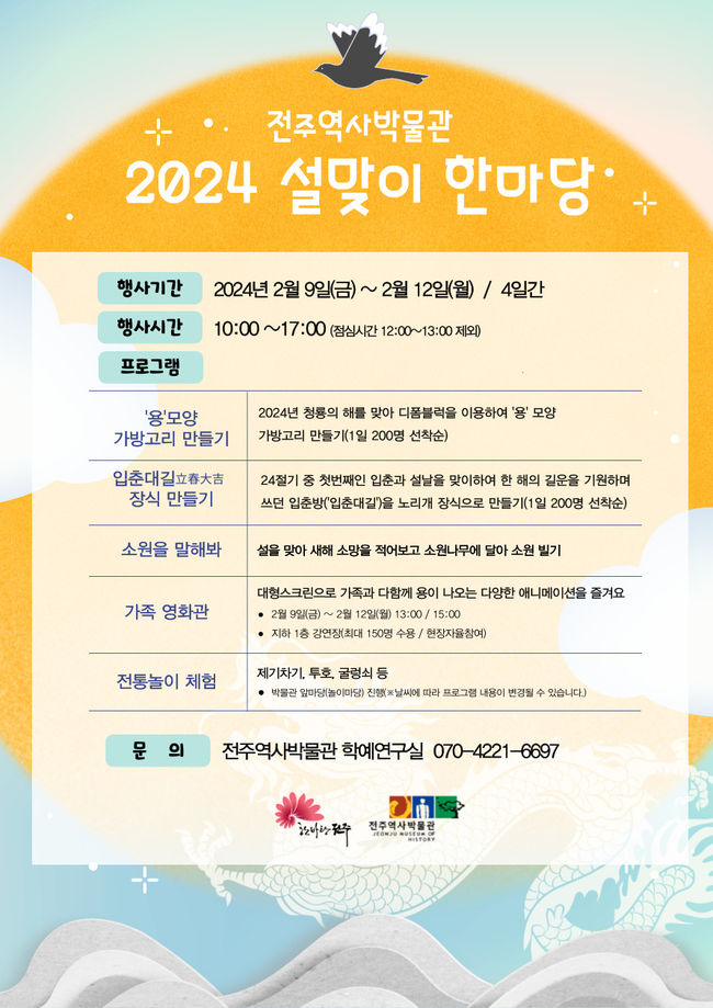 전주역사박물관은 오는 2월 9일부터 12일까지 4일간 설날을 맞아 시민 누구나 즐길 수 있는 ’2024 설맞이 한마당‘을 운영한다고 29일 밝혔다.