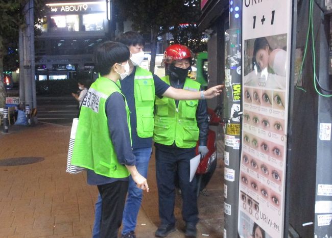 불법광고물 야간 단속 중인 단속원들