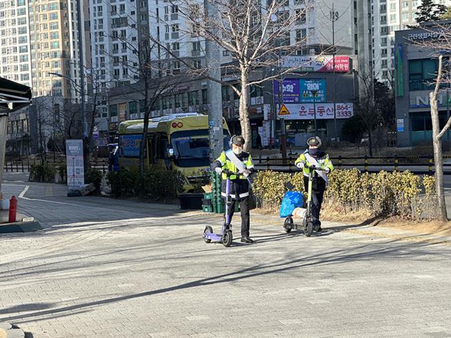 모범운전자회 서포터즈가 인하대학교 역사 주변 PM 기기를 정리하고 있다.