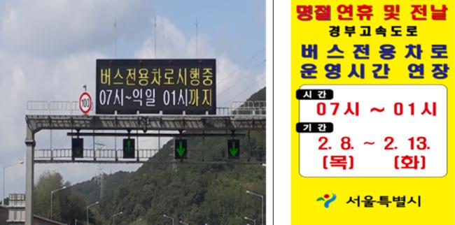 서울시는 설 연휴 기간(2월 8일~13일) 경부고속도로 한남대교 남단부터 양재IC 구간 버스전용차로의 단속 시간을 오전 7시부터 새벽 1시로 연장한다고 밝혔다. 경부고속도로 버스전용차로는 평상시 오전 7시부터 오후 9시까지 운영된다.