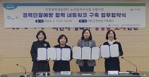 인천광역새일센터와 남동시니어클럽, 부평구노인인력개발센터, 서구노인인력개발센터는 2024년 2월 7일 (재)인천여성가족재단에서 경력단절예방 협력 네트워크 구축 업무협약을 체결했다.