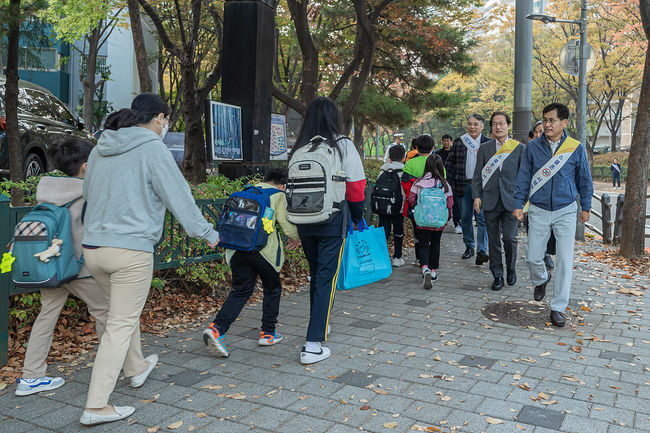 양명초등학교 등하굣길에서 아이들의 안전을 살피고 있는 이기재 양천구청장