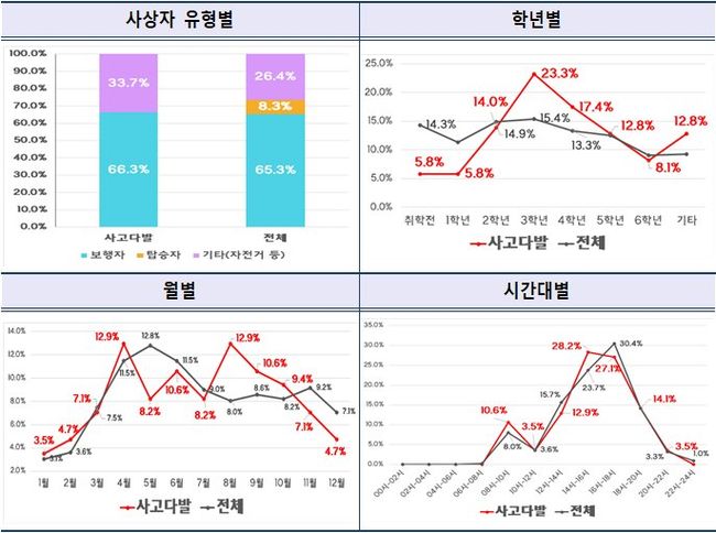 학년별로는 3학년이 87명(15.4%)으로 교통사고 비중이 가장 높았고, 고학년(4학년 이상)으로 갈수록 감소하는 것으로 나타났다.