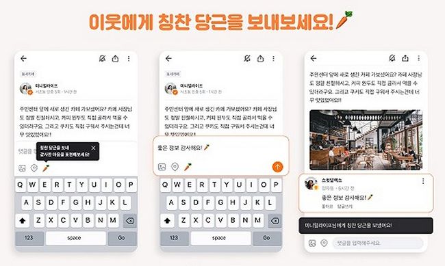 당근마켓은 오늘부터 전국의 `동네생활`에서 이웃에게 고마운 마음을 표현할 수 있는 `칭찬 당근` 댓글 기능을 새롭게 선보인다.