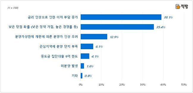 2022년 하반기에 아파트 청약 계획이 있다고 답한 응답자 988명 중, 현재 가장 걱정되는 점이 무엇인지 묻는 질문에 ‘금리 인상으로 인한 이자 부담 증가’라고 답한 응답자가 39.1%로 가장 많았다. 그 다음으로 △낮은 청약 가점, 높은 경쟁률 등으로 인한 낮은 당첨 확률(35.4%) △분양가상한제 개편에 따른 분양가 인상 우려(12.9%) △관심지역에 분양 단지 부족(6.1%) 등의 순으로 응답률을 보였다.