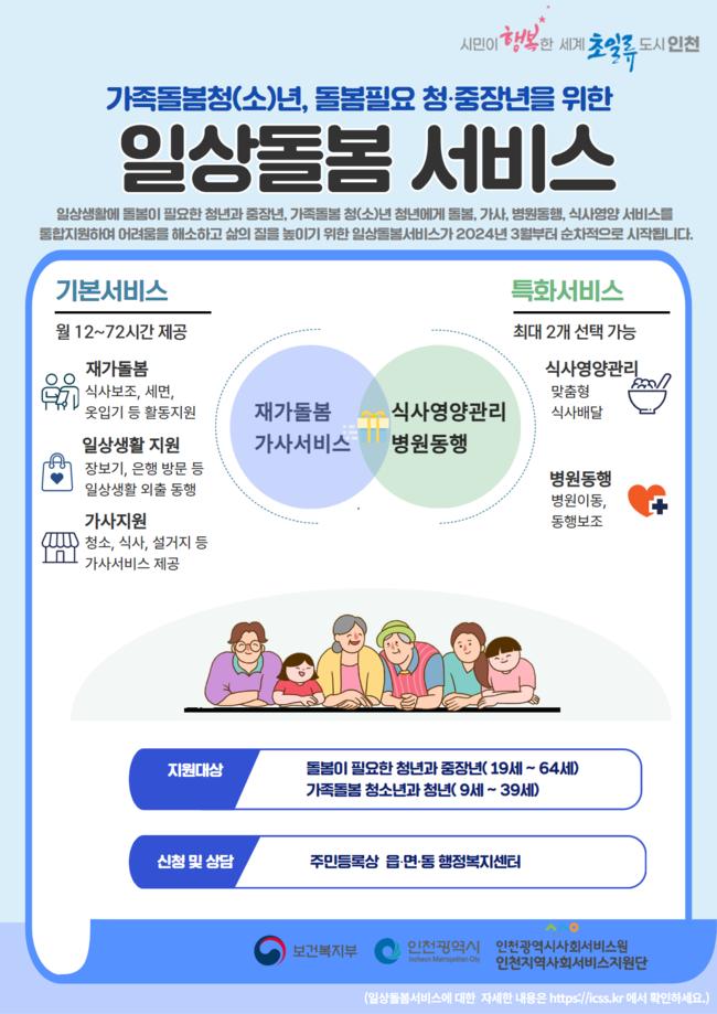 인천시가 노인, 아동, 장애인 중심의 돌봄서비스를 가족돌봄청(소)년과 돌봄필요 청·중년까지 확대한다.