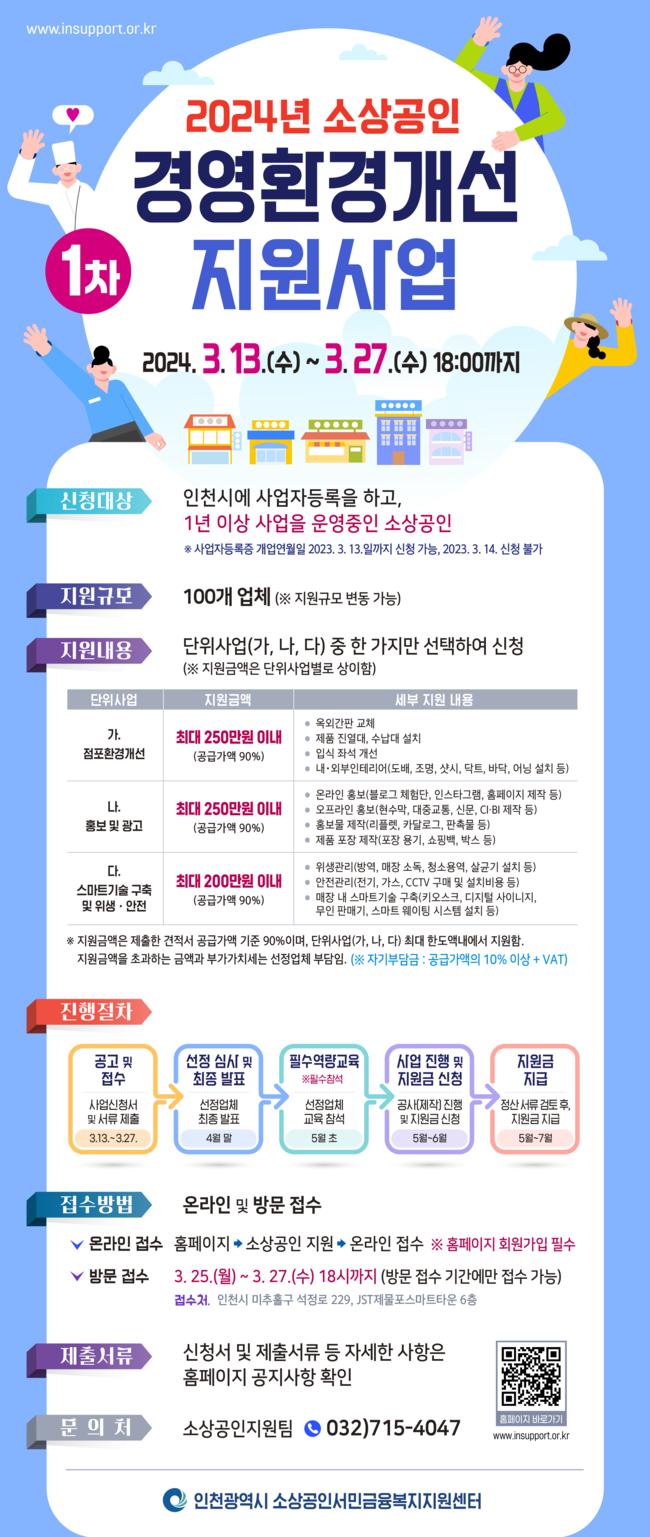 인천시가 지역 소상공인들의 경영안정과 자생력 강화를 위해 ‘2024년 1차 소상공인 경영환경개선사업’을 추진한다.