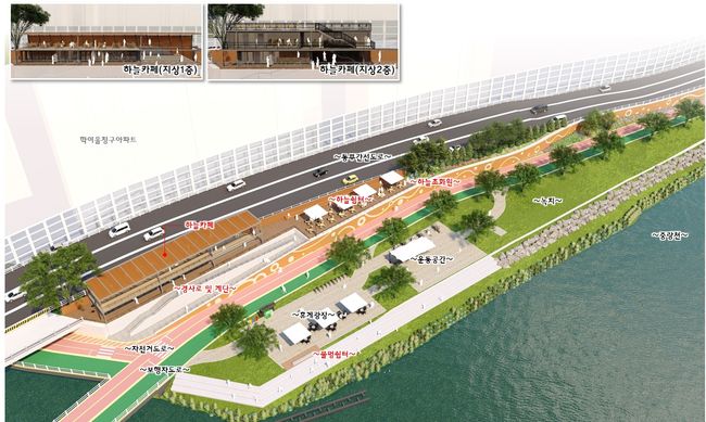 동부간선도로 인접 옹벽 상부에 경관을 저해하는 녹지대 약 1,979㎡ 면적을 활용하여 편의점을 갖춘 2층 규모의 ▲쉼터를 조성하고 휴게공간을 대폭 확충한다. 쉼터내에는 ▲전망대도 갖춰 구는 방문객들의 명소가 될 것으로 기대하고 있다. 전망대 지붕에는 ▲태양광 발전설비를 설치하여 유휴공간의 기능성을 최대한 확보할 예정이다. 기존 옹벽은 철거 후 재정비하여 ▲벽화, 조명 설치로 하천의 미적 기능을 추가하고, 하천과 접한 호안에는 약 100m 길이의 ▲계단식 수변 스탠드에서 ‘물멍’하는 여유를 가질 수 있도록 정비한다.