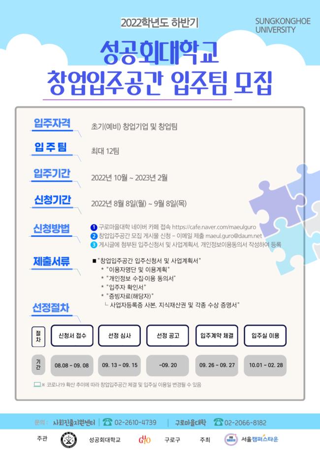 구로구가 8일부터 2022년 하반기 성공회대 구로마을대학 창업입주공간 입주팀을 모집한다.