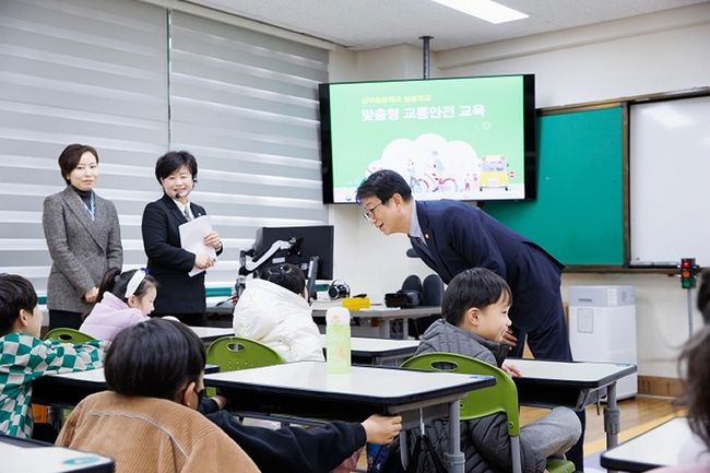 박 장관은 교통안전 전문강사와 함께 초등학교 1학년 학생들을 대상으로 어린이들의 흥미를 유발할 수 있는 체험형 프로그램을 활용하여 교통안전 교육을 진행했다.