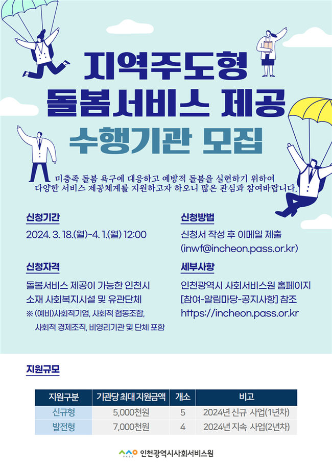 인천시사회서비스원(원장‧황흥구)은 지역주도형 돌봄서비스 제공사업에 참여할 지역 내 사회복지시설과 유관 단체를 모집한다고 26일 밝혔다.