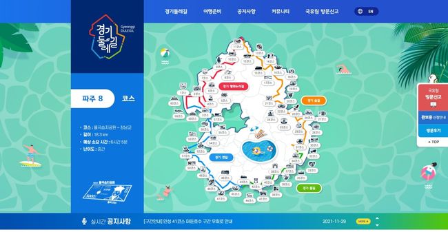 최용훈 경기도 관광과장은 “개편된 누리집 서비스를 통해 이용자들이 더 쉽고 편리하게 둘레길을 이용할 수 있을 것”이라며 “앞으로도 이용자를 위한 서비스 개선과 다양한 콘텐츠 확보를 위해 꾸준히 노력하겠다”고 말했다.