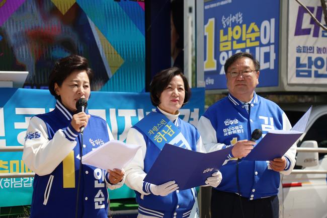 더불어민주당 서울송파구병 남인순 후보, 경기하남시갑 추미애 후보, 경기성남시수정구 김태년 후보는 31일 송파구 위례중앙광장에서 공동 기자회견을 갖고 “위례신도시 광역교통개선대책의 하나인 위례신사선의 정상화를 최우선 과제로 함께 추진하겠다”고 밝혔다.