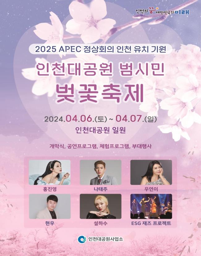 ‘인천대공원 범시민 벚꽃축제’는 지난해에도 이틀간 약 17만 명이 다녀가는 등 인천의 대표 축제로 자리 잡았으며, 올해에는 2025 아시아태평양경제협력체(APEC) 정상회의 인천 유치를 기원하는 마음을 담아 개최된다.