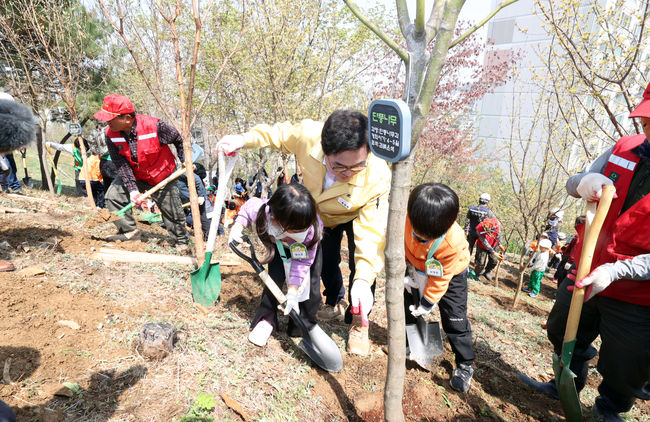 지난해 4월 식목일을 맞아 박일하 동작구청장이 상도근린공원에서 어린이들과 함께 나무를 심고 있는 모습 (제공=동작구)