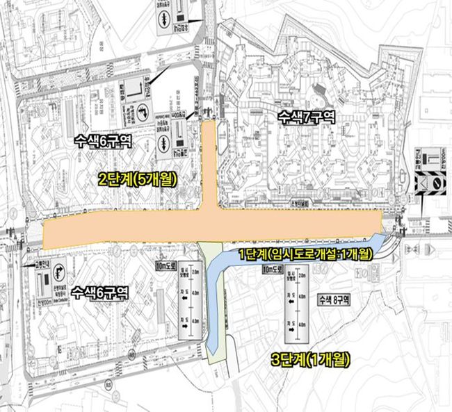 공사는 총 3단계의 과정으로 진행된다. 1단계 공사는 수색8구역 내 일부 건축물을 철거해 250m 연장의 왕복 2차선 우회도로를 개설한다.