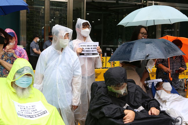 홈리스행동과 전국장애인차별철폐연대(전장연)는 9일 서울시청 앞에서 `서울시 장애인 · 홈리스 등 취약계층 코로나19 대응 방안 마련 촉구` 기자회견을 진행했다.기자회견에서 이들 단체는 민간 의료기관에 갈 수 없거나 자체 격리 공간을 마련할 수 없는 장애인, 노숙인(홈리스)이 코로나19 위험에 노출되지 않도록 지원해 줄 것을 촉구했다.