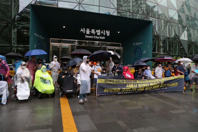 홈리스행동과 전국장애인차별철폐연대(전장연)는 9일 서울시청 앞에서 ‘서울시 장애인·홈리스 등 취약계층 코로나19 대응 방안 마련 촉구’ 기자회견을 진행했다.