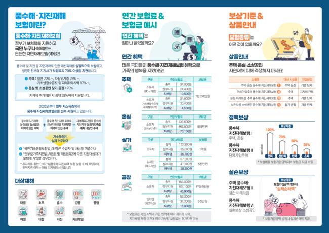 보험 가입 대상은 주택, 온실, 소상공인의 상가·공장으로, 정부와 지자체는 저렴한 보험료로 풍수해 및 지진 피해를 보상받을 수 있도록 최소 70%, 지자체의 재정적 여건에 따라 최대 92%까지 지원한다.