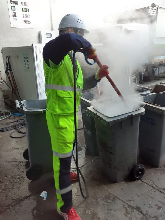 수거된 RFID 종량기들이 자원순환공원에서 고온 스팀으로 세척되고 있다