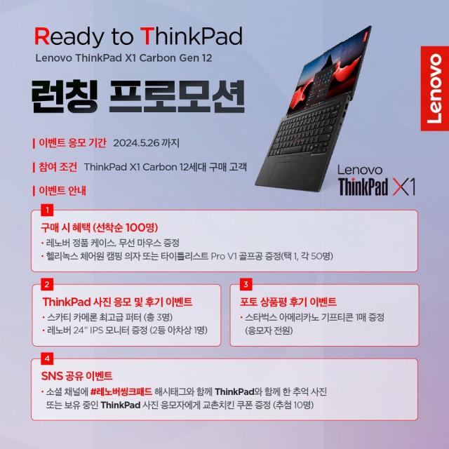 한국레노버가 ‘씽크패드 X1 카본 12세대’ 출시 기념으로 5월 19일까지 네이버, 지마켓, 11번가, 컴퓨존 등 오픈마켓에서 프로모션을 진행한다.