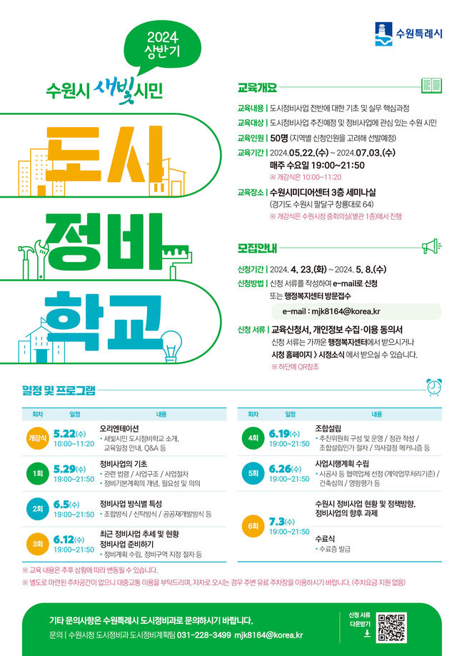 수원시,‘새빛시민 도시정비학교’참여자 50명 모집 - 수원시·수원시정연구원, 5월 29일~7월 3일 매주 수요일 강좌 진행