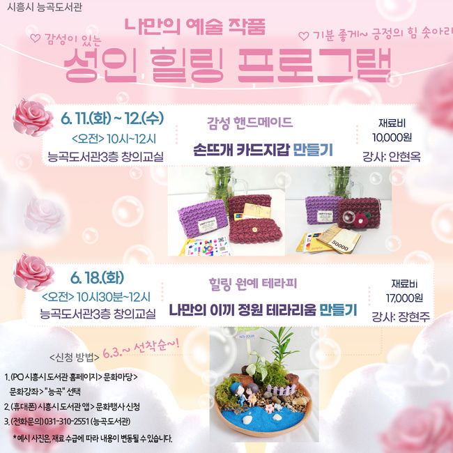 ▲6월 11일부터 12일(오전 10시~12시)에는 책과 함께 소소한 일상과 이야기를 나누는, 감성 수제 작품을 완성하는 ‘손뜨개 카드 지갑’ 만들기가 진행된다. ▲6월 18일(오전 10시 30분~12시)에는 그림책을 통해 자신의 현재 감정을 읽고 치유의 시간을 갖는 ‘나만의 이끼 정원 테라리움’ 만들기 강좌가 진행된다.