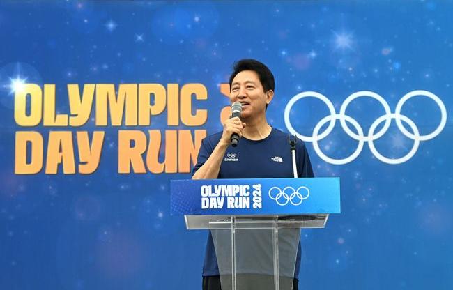 오세훈 서울시장이 23일 오전 7시 20분 올림픽공원 평화의광장 일대(송파구 방이동)에서 열린 `올림픽데이런 2024`을 찾아 참가자들을 응원하고, 내달 열릴 ‘2024 파리올림픽’에서 대한민국 선수들의 선전을 기원했다.