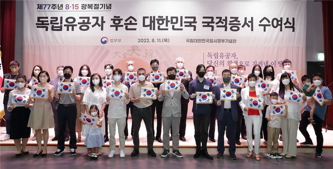 법무부는 11일 11시 국립대한민국임시정부기념관에서 “제77주년 광복절을 기념 독립유공자 후손 대한민국 국적증서 수여식”을 개최하여 계봉우(’95년 독립장) 선생 등 독립유공자 11인의 후손 20명에게 대한민국 국적증서를 수여했다고 밝혔다.