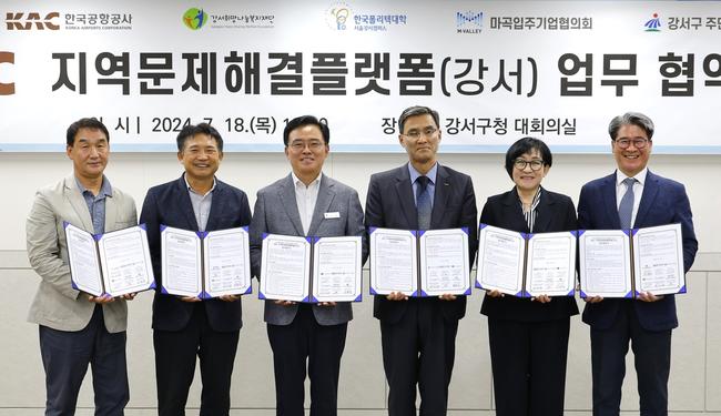 구는 18일(목) 오후 구청 대회의실에서 한국공항공사(사장직무대행 이정기), 강서희망나눔복지재단(이사장 고건상), 한국폴리텍대학 서울강서캠퍼스(학장 여상태), 마곡입주기업협의회(회장 김낙희), 주민자치협의회(회장 서덕순)와 `지역문제해결 플랫폼 구축 업무협약`을 체결했다.