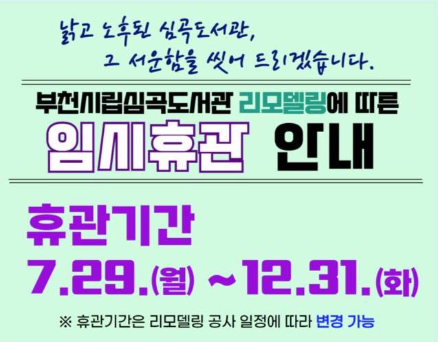 부천시립심곡도서관이 리모델링 공사 추진에 따라 오는 7월 29일부터 임시휴관에 들어간다.