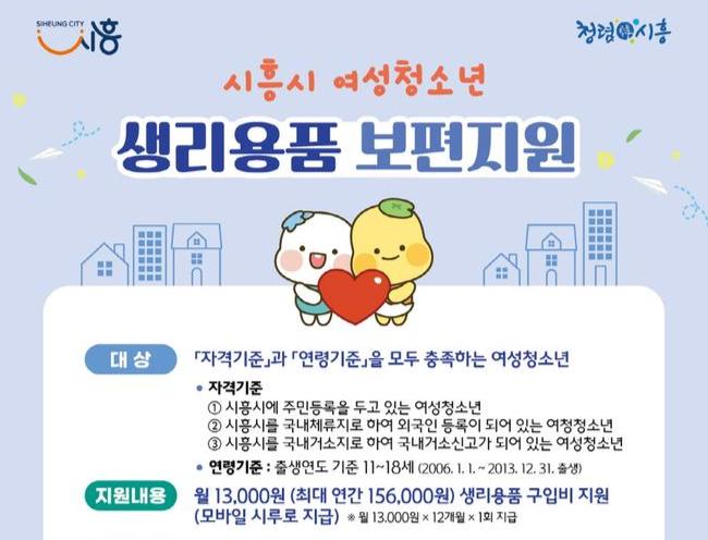 이 사업은 여성 청소년들이 생리용품을 구입할 수 있도록 시흥 지역화폐 `시루(모바일)`를 지원하는 정책으로, 월 1만 3천 원, 연간 최대 15만 6천 원을 지원한다.