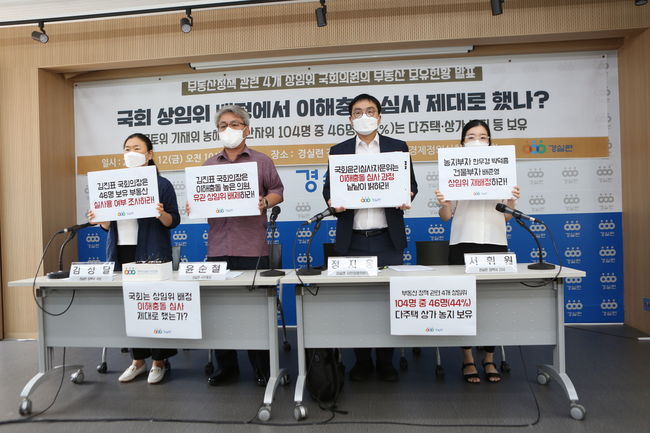 경제정의실천시민연합(경실련)은 12일 서울 종로구 경실련 강당에서 `상임위 배정 국회의원 부동산 보유 현황` 결과를 발표했다. 경실련 조사 결과 부동산 관련 국회 상임위 4곳에 배정된 국회의원 10명 중 4명이 다주택자 또는 대규모의 농지·대지를 보유하고 있는 것으로 나타났다.