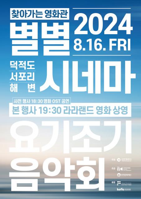 인천영상위원회, 덕적도 해변에서 ‘별별시네마X요기조기음악회’ 개최 - 8월 16일 19시 30분 덕적도 서포리 해변 야외무대에서 ‘라라랜드’ 상영 - 상영 전 인천문화재단 주관 ‘요기조기음악회’ 사전 행사