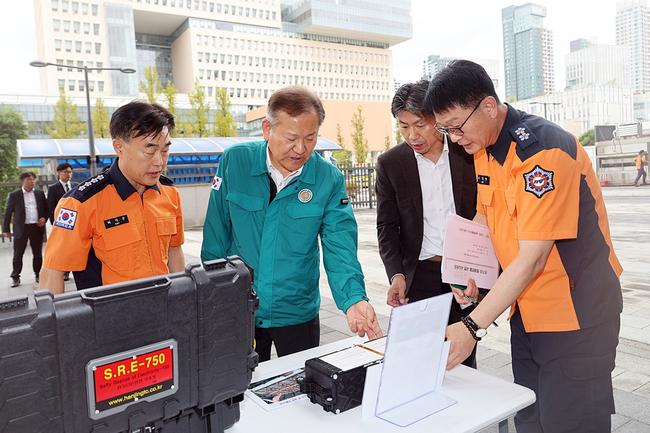 이상민 행정안전부 장관이 지난 21일 오후 소방청을 방문하여 2024년 을지연습상황보고를 받은 후 전기차 화재진압 시연을 위한 소방장비를 살펴보고 있다.