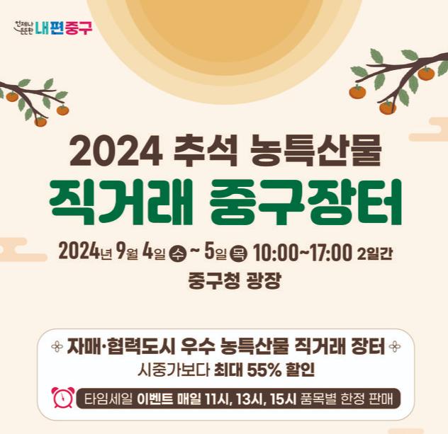 서울 중구는 추석을 맞이해 9월 4일부터 5일까지 중구청 앞 광장에서 직거래 장터를 운영한다.