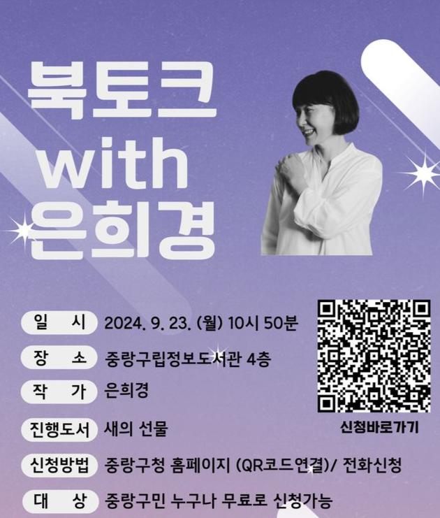 중랑구는 오는 9월 23일 중랑구립정보도서관 4층 대강당에서 작가와 직접 만나는 특별한 독서 프로그램을 개최한다. 이번 행사는 은희경 작가를 초청하여 ‘북토크 with 은희경’이라는 주제로 진행되며, 구민에게 작가와 소통하는 등의 문학적 경험을 제공하고 독서를 장려하기 위해 마련되었다.