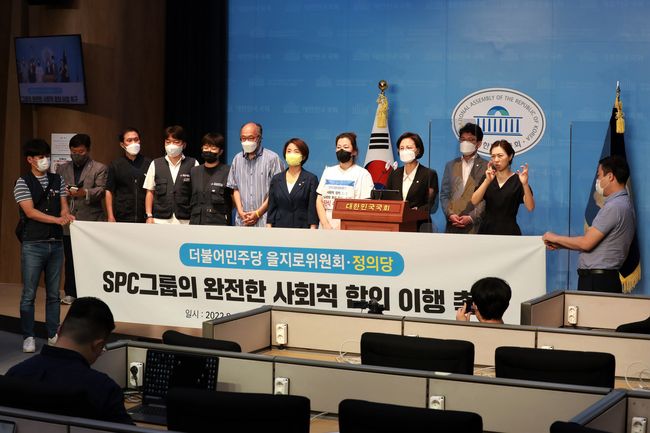 더불어민주당 을지로위원회 소속 의원들과 정의당 의원들, 그리고 민주노총 화섬식품노조 파리바게트지회 관계자 등은 지난해 12월부터 야기된 SPC그룹 노사 갈등 문제와 관련해 합동 기자회견을 12일 국회 소통관에서 진행했다.기자회견에서 주최 측은 SPC그룹이 지난 2018년 노조와 체결한 `사회적 합의`를 이행했는지를 검증하자고 요구했다.