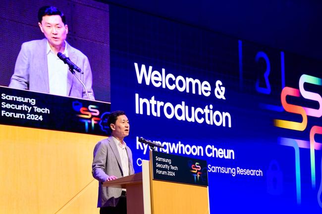 삼성전자 서울 R&D캠퍼스에서 개최된 `제8회 삼성 보안 기술 포럼`에서 삼성전자 DX부문 CTO겸 삼성리서치장 전경훈 사장이 환영사를 하고 있다.