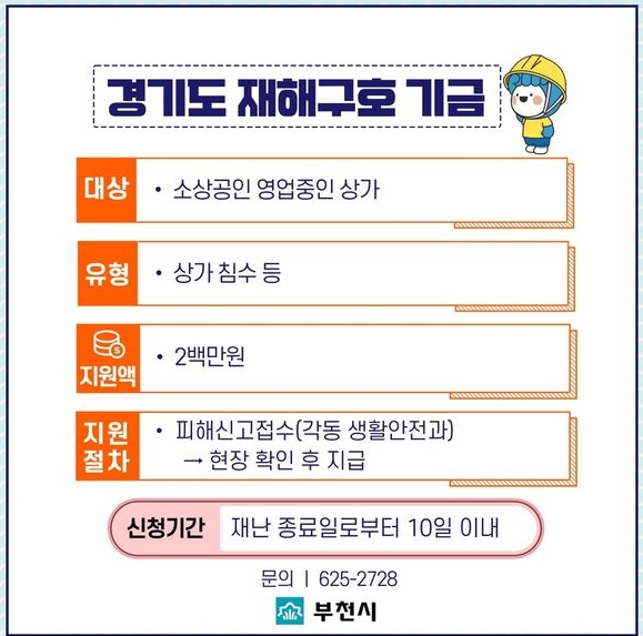 더불어, 침수 등으로 재산피해를 입은 관내 중소기업에 ‘재해중소기업 특례보증’으로 최대 2억원 규모의 융자에 대한 보증지원을 한다. 부천시 기업지원과를 통해 피해사실이 확인되면, 피해사실확인서를 지참하여 경기신용보증재단 부천지점에서 접수하면 된다.