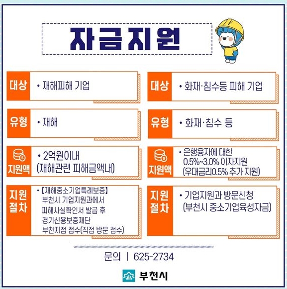 또 은행융자에 대해 0.5%~3.0%의 이자를 지원하는 중소기업육성자금을 비롯해, 침수피해기업의 경우 추가 우대금리 0.5%를 제공한다. 대상자는 부천시청 기업지원과에서 방문 접수하거나 온라인(문서24)으로 신청하면 된다.