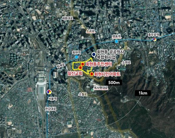 휴먼타운 2.0 후보지 위치(노란색 실선 내) 회현동