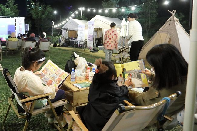 얀양천 야외도서관 `책읽는 구로`를 방문한 아이들이 책을 읽고 있다.