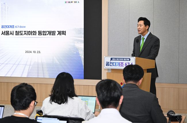 오세훈 서울시장이 23일(수) 오전 시청 본관에서 열린 서울시 철도지하화 통합개발 기자설명회에서 모두발언을 하고 있다.