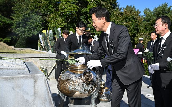 오세훈 서울시장은 26일 오전 11시 국립서울현충원(동작구 현충로 210)에서 열린 ‘박정희 대통령 서거 제45주기 추도식’에 참석해 헌화했다.