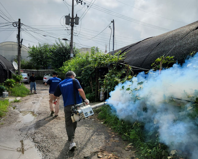 과천시보건소에서는 이번 집중호우로 침수 피해를 입은 가구와 이재민 거주시설로 사용되고 있는 마을회관, 대규모 주거용 비닐하우스가 밀집한 꿀벌마을 등에 대해 지난 11일부터 방역반을 가동해 집중 방역 및 소독 작업에 돌입했다.