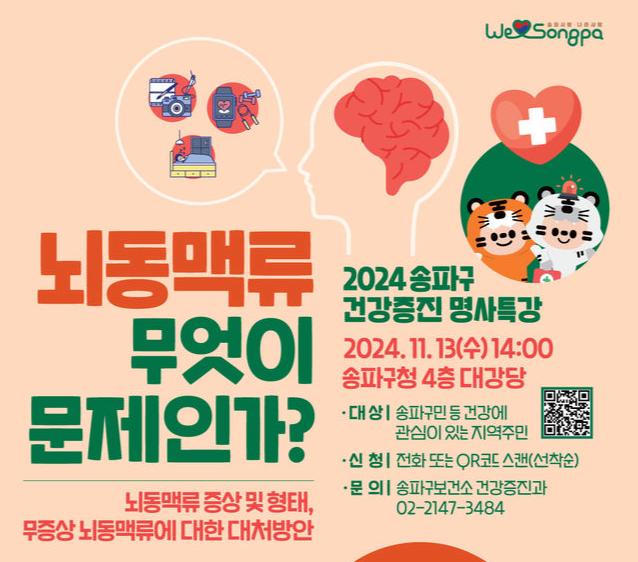 송파구가 일교차 큰 환절기를 맞아 오는 11월 13일 오후 2시 구청 대강당에서 뇌혈관 질환 ‘뇌동맥류’를 주제로 한 ‘건강증진 명사특강’을 개최한다고 알렸다.