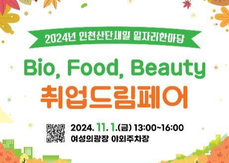 인천광역시(시장 유정복) 여성의광장 인천산단여성새로일하기센터(이하 `인천산단새일센터`)는 오는 11월 1일 오후 1시부터 여성의광장(연수구 동춘동) 야외광장에서 `2024년 Bio, Food, Beauty 취업드림페어`를 개최한다고 밝혔다.