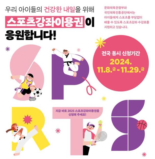 대상자로 선정되면 1년간 매월 10만 5천 원 범위 내 스포츠 강좌 수강료를 지원받게 된다.