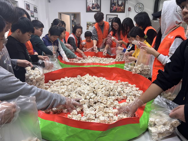 서울 성북구 삼선동 자원봉사캠프가 지난 15일부터 16일까지 이틀에 걸쳐 자원봉사자들과 함께 직접 한과를 만들고 포장하였다. 이와 더불어 어르신들에게 인기 만점인 깍두기와 식혜도 함께 준비했다.